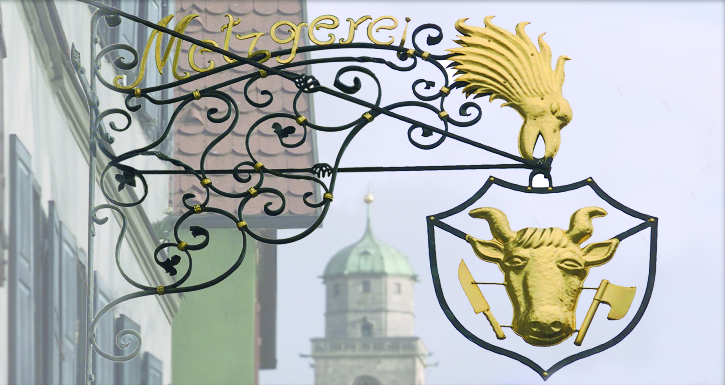Ein schmiedeeiserner oder vergoldeter Schriftzug mit Wappen oder Symbol unterscheidet traditionelle Geschäfte und Gasthäuser von Massenbetrieben.